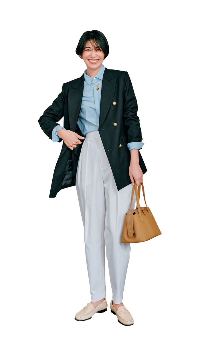 袖からシャツのブルーを見せるとネイビーのジャケットも軽快に。遊びのあるネックレスで真面目スタイルに抜け感を。シャツはエーケー ワン、ジャケットはウィム ガゼット、パンツはカレンソロジー、バッグはヴァジック、ローファーはヘリュー。