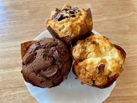 焼きたてのマフィンがカウンターに並べられた様子は、眺めているだけでもテンションが上がります。 手作りなので、やはりひとつひとつマフィンの焼き色やトッピングの感じも違っています。 メニューを見て購入するマフィンを決めたはずが、予想外に出てくる焼きたてのマフィンや季節限定の味にも悩まされ、うんうん唸ってしまうのもまた一興! ちなみに今回いなばが購入したのはキャロット・ブルーベリー・トリプルチョコの3種類です。