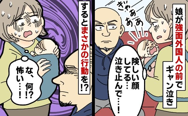 生後10カ月の娘と電車でお出かけをしたある日のこと。抱っこひもを嫌がる娘は電車で不機嫌になってしまい、あやしても泣き止みません。さらに目の前には強面の男性外国人が。怯えながら降車駅を待っていると……?