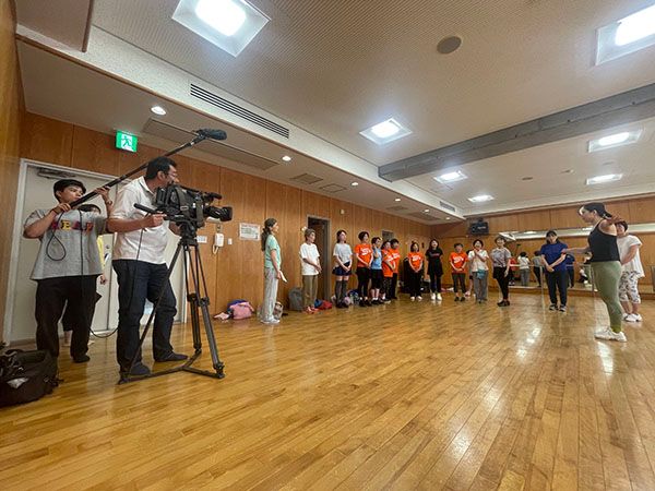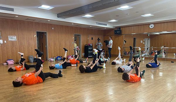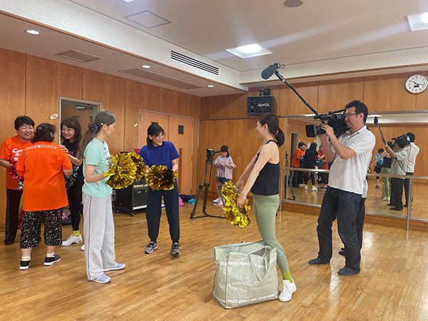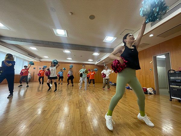 年末紅白で聞いた曲「ア○ドル」のサビの部分が今回の体験のテーマ曲です。ダンスなんて90年代ディスコブーム時代に踊ったユーロビート以来。ゴールドのポンポンをお借りしてさっそく体験開始!