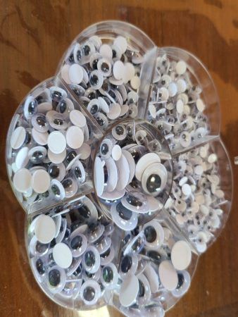 目のシールやフェルトなど飾りも豊富です。目のシールだけでも沢山あるなあ。すごい。