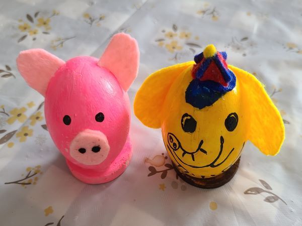 先生のアドバイスで、フェルトで耳と尻尾と赤い口をつけました。耳には黄色の絵の具をつけました。ついに完成です。