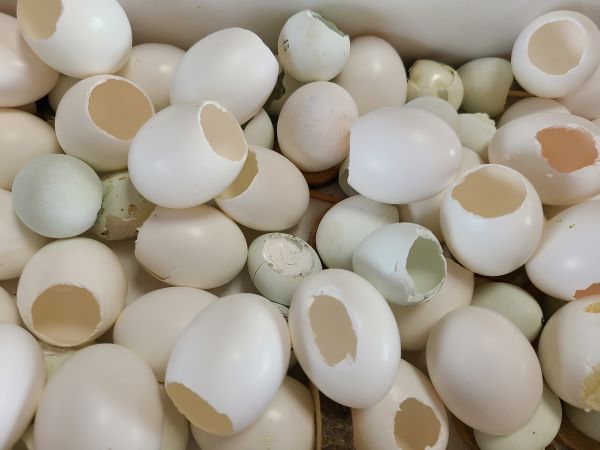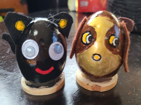 「たまごの殻アート」とは、たまごの殻を洗浄して乾燥させ、ウレタンやシリコンを入れ、絵を描くものです。たまごも、大きさや形もさまざま。インコ、うずら、にわとり、だちょうの卵がありました。