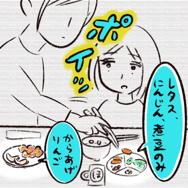 さあやちゃんのからあげとりんごを全部自分のお皿に移すと、自分のお皿からさあやちゃんのお皿ににんじんをポイッ。