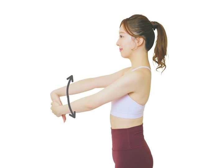 手のひらを下に向けて作業することが多いと、腕や手は硬くなりがち。伸ばすことでしっかりほぐして。余裕があれば腕を上下に動かす。