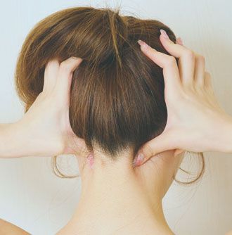 頭と首の境目を親指で軽く押さえ、親指以外の指で頭を包み込む。親指で500円玉の大きさの円を描くように、気持ちいい程度にほぐす。