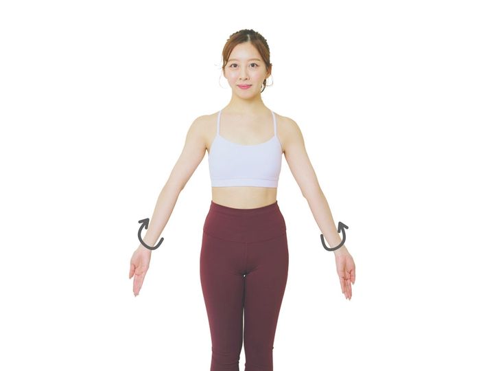 腕を下に伸ばしたら親指からひじのシワが外側になるように内側にねじる。〝鎖骨からが腕〟という意識で、腕全体を誘導するように!