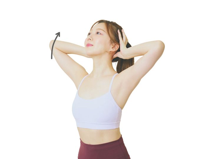 アゴの先端を天井に向けていくイメージで、首の伸びを気持ちよく感じて。ひじを前に出せば肩の負担を軽減。