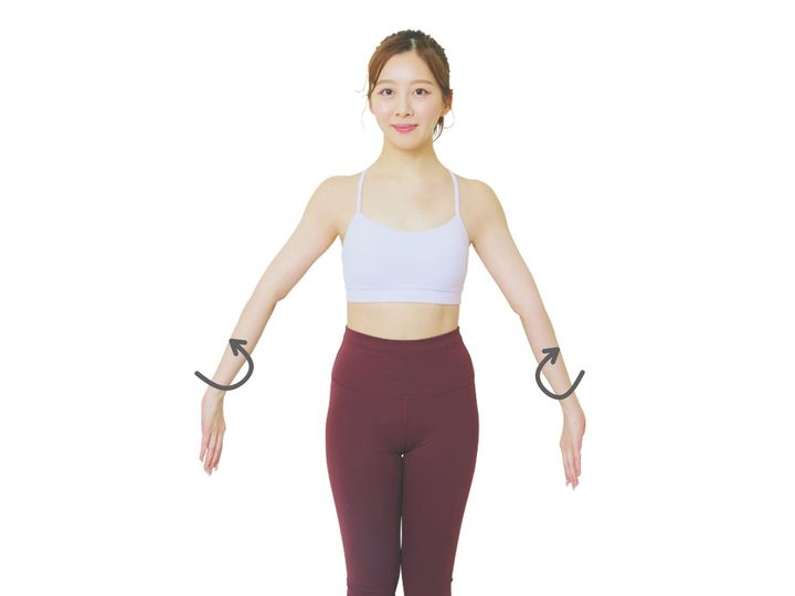 腕を下に伸ばしたら小指と薬指からひじのシワが内側になるように外側にねじる。1と2の動きを1セットで、自然な呼吸でOK!