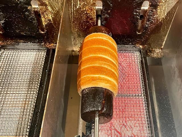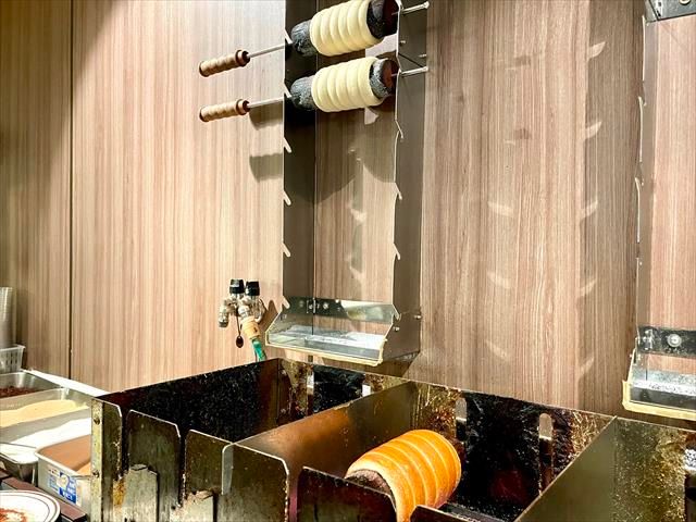 専用の棒にクルクルと巻きつけられた生地を、こちらの専用の機械で回転させながら5分焼き上げたら完成です。
