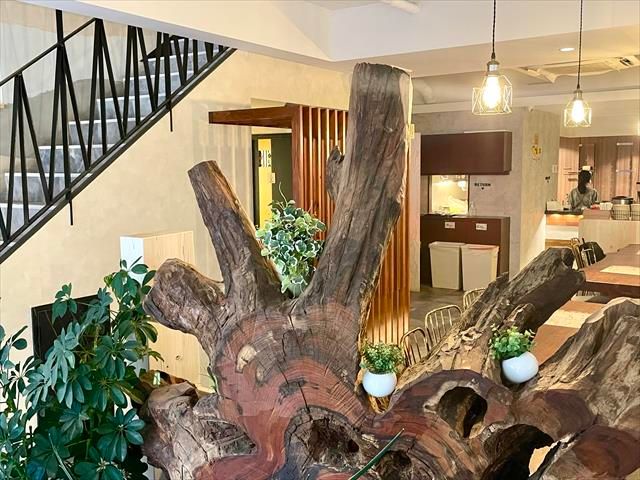 お店に入ると1階は、テーブル席を中心に、木目を基調とした落ちついた空間になっています。注文は奥のカウンターで行いますよ。