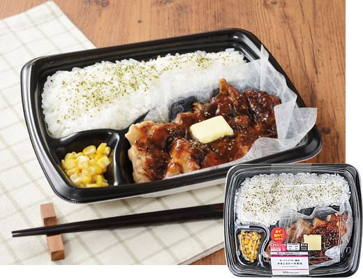 食べ応えのあるチキンステーキに醤油ガーリックソースとコクのあるバターをトッピングした食欲をそそるお弁当です。間違いないおいしさ!