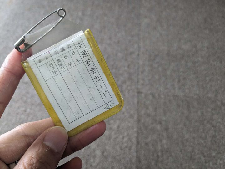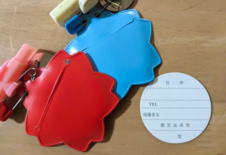 娘たちが使っている名札の裏には、住所、保護者氏名、連絡先、血液型が記入できるようになっています。