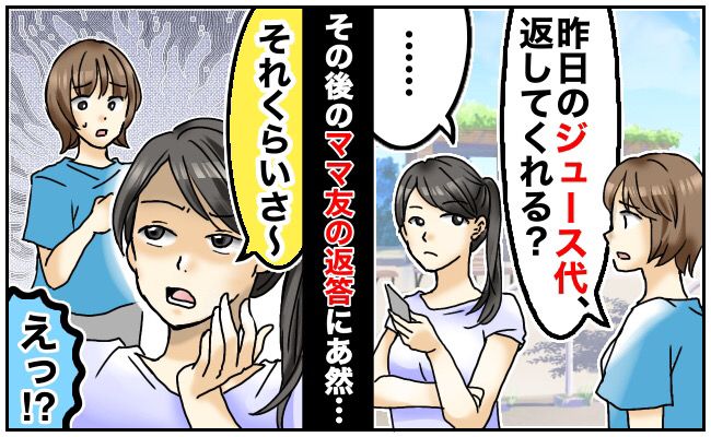 「ジュース代返してくれる?」手持ちがないママ友にジュース代を貸した私→翌日、話を振ってみると…