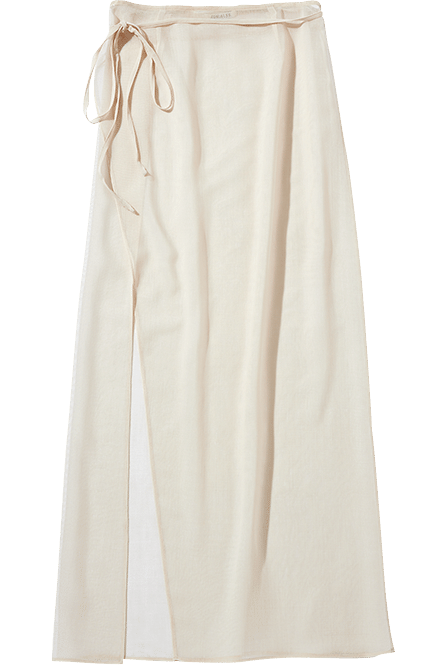 レースのスカートと同様に、レギンスやデニムに重ねて楽しむのがベター。コーデを新鮮に見せる一手。シアーラップスカート¥35,200(オーラリー)