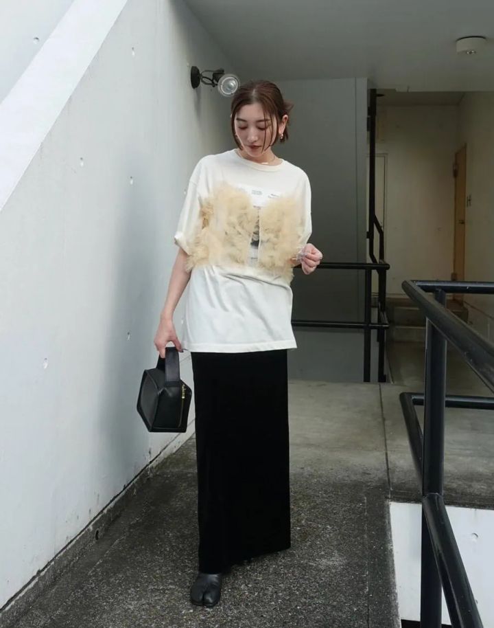 箔プリントを施したTシャツにロングスカートという、シンプルながらモードなムード漂う着こなし。サラリとした素材なら、カジュアルな組み合わせでもどこかきちんと感が。