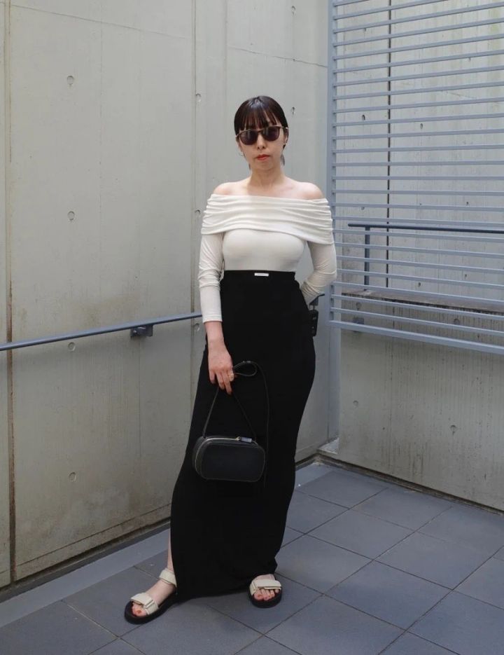ボディラインを美しく見せてくれるジャージ素材のロングスカートでヘルシーな女性らしさを。シルエットの美しさが生きる、大人のシンプルコーデ。