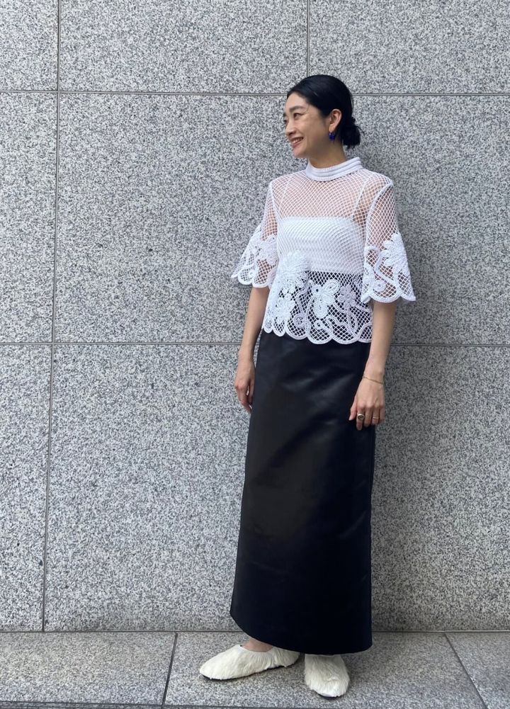 存在感たっぷりの透かし編みトップスを引き立てるのはやはり細身シルエットのロングスカート。ツヤのある素材感で、トップスの甘さをモダンにシフト。