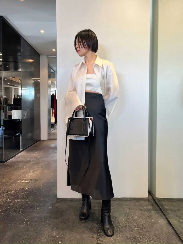 しなやかなライン、ツヤと透け感のある軽やかな素材感が美しいスカートは、人気ブランド、ジア ストゥディオスのもの。その存在感を存分に生かしたモードな着こなしが◎。