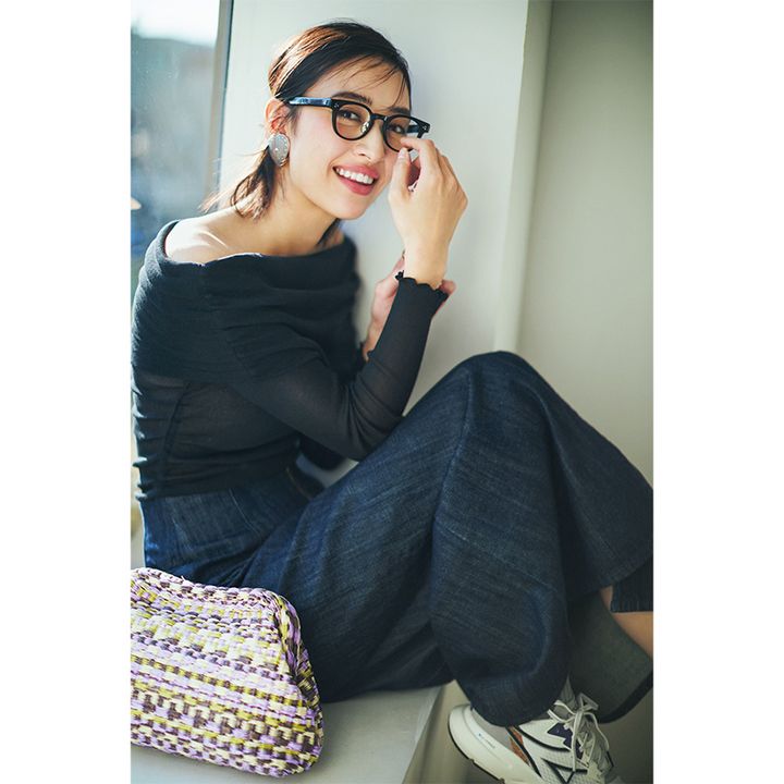 カットソー¥3,590(ザラ)スカート¥28,600(ルフィル/ル フィル ニュウマン 新宿店)メガネ¥39,600(プロポ/プロポデザイン)イヤリング¥34,100(ハルポ/ロンハーマン)リング¥33,000(アサミフジカワ/ショールーム セッション)バッグ¥30,000(カテリナべルティーニ/デ・プレ)ソックス¥3,850(ルール ロジェット/ブランドニュース)スニーカー¥28,600(ディアドラ)