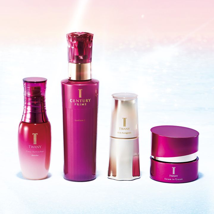 左から:《出荷数量No.1トワニーの顔!》誘導美容液のパイオニア。発売当時から人気の独特の浸透力ととろみ感触は健在。トワニータイムリフレッシャー60ml¥5,500《表情筋ケア発想のプレミアムライン》複合エイジングに対応するラインの化粧水。同センチュリープライムローション全2種[医薬部外品]180ml¥11,000《最先端技術搭載美容液は翌朝が違う!》カネボウ化粧品の40年に及ぶヒアルロン酸研究に基づく独自成分「NAG2.0」配合。なめらかな印象のハリ肌に。同スキンオーラジェニック30ml¥16,500《全世代に人気のエイジングクリーム》ベタつかず、角層まで浸透してうるおいを与えて離さない。同セラムインクリーム[医薬部外品]30g¥11,000※スパチュラ付き