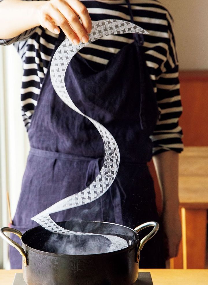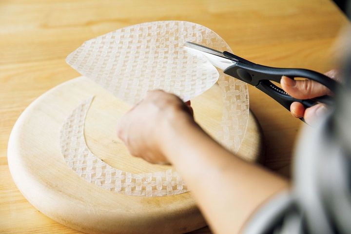 ライスペーパー1枚はキッチンばさみで幅3cm程度の渦巻き状に切る。残りも同様にする。