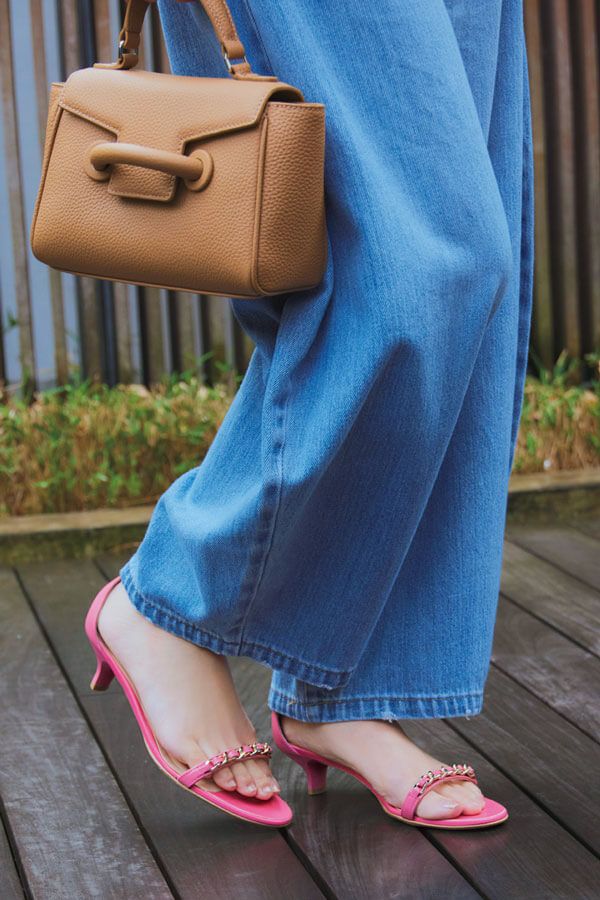 太めデニムと細ストラップの対比で足元の華奢感がアップ