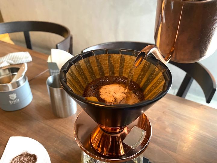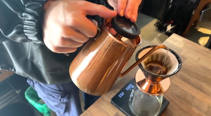 お待ちかねのドリップ作業を行なっていきます!コーヒーを入れる際、一般的にお湯は1回で入れるのではなく3回程度に分けて入れるそう。今回の体験でも3投に分けて90度のお湯を注いでいきます。