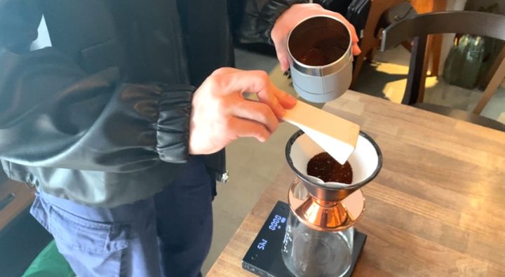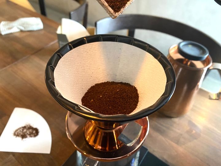 ペーパーフィルターに15g(1人前)のコーヒー粉を投入。入れたあとは、表面が平らになるように揺らしたり、トントンと叩いたりして整えていきます。こうすることで密度が高まり、コーヒーの味(成分)が出やすくなるのだとか。