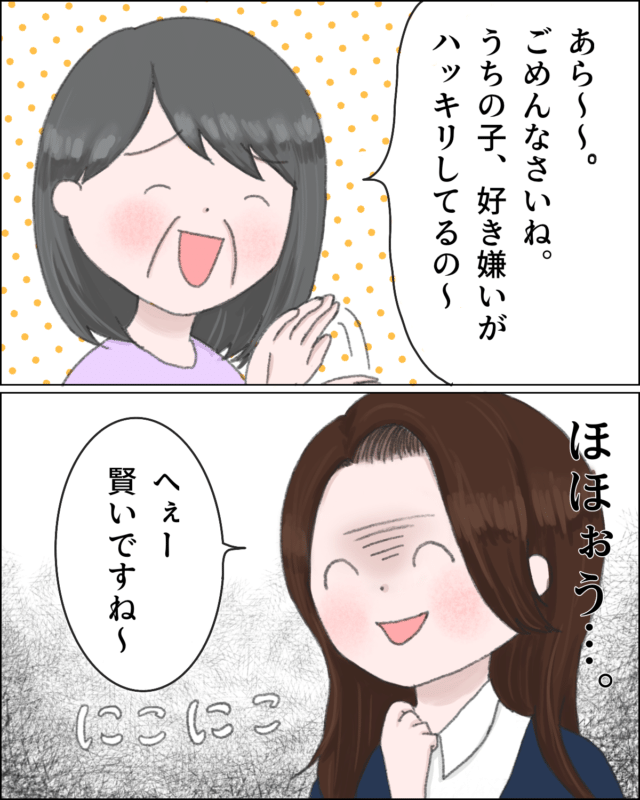 「あら~ごめんなさいね。うちの子、好き嫌いがはっきりしてるの~」