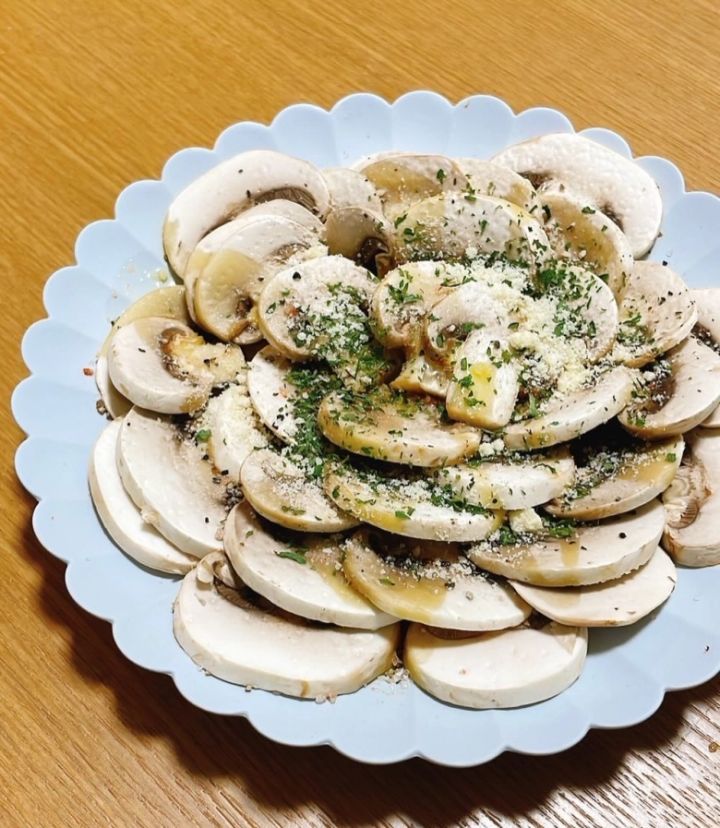 鮭のちゃんちゃん焼きにはヘルシーなきのこの副菜を合わせると、罪悪感なくボリュームアップ!マッシュルームをカットして粉チーズとオリーブオイル、レモン汁と塩コショウをかけるだけで完成です。きれいに盛りつければ食卓に花が咲いたように♪