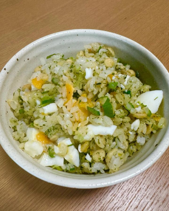 ごはんに半熟卵と、天かすや青のり、ごまなどを混ぜ込んだメニューです。鮭のちゃんちゃん焼きは食感がくたっとしたものが多いので、天かすを加えたごはんにすれば、ザクザクした歯ごたえで食感にメリハリが出ますよ。