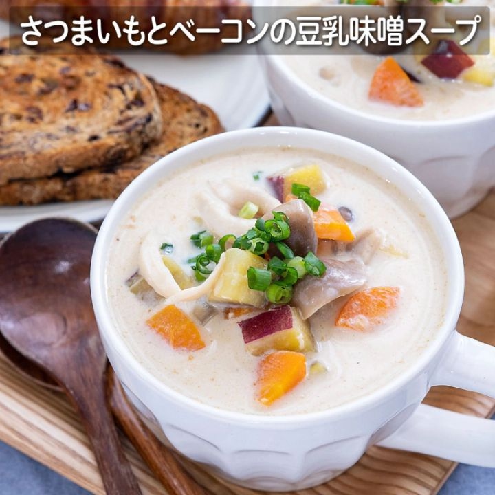 鮭のちゃんちゃん焼きと同じみそで味つけしても、豆乳で作ったスープなら印象ががらりと変わるはず。写真はさつまいもやにんじん、シメジなどで作られていますが、どんな野菜でも合わせやすいので、冷蔵庫に残った半端な野菜で作ってみてください!
