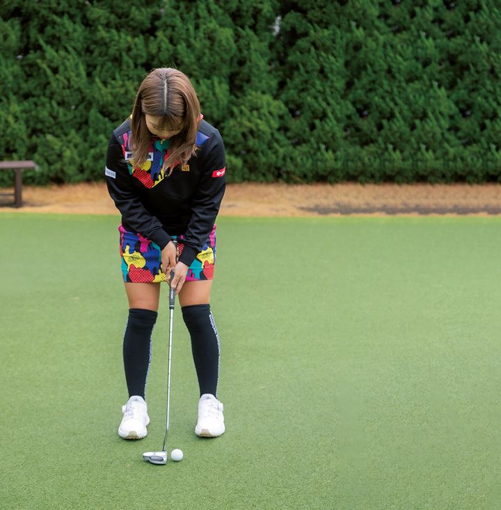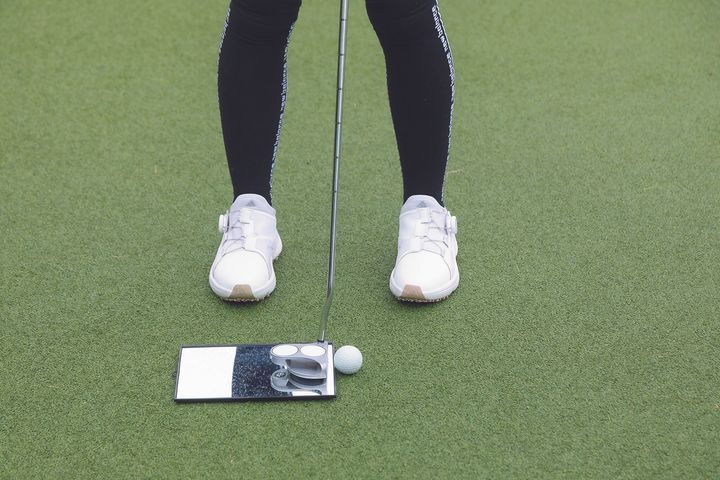 「頭が動くとパットもブレちゃうので、鏡に映った自分の目線や目印が動かないよう、頭を固定してパッティング。ゴルフ専用のミラーもおすすめです」(坂口)