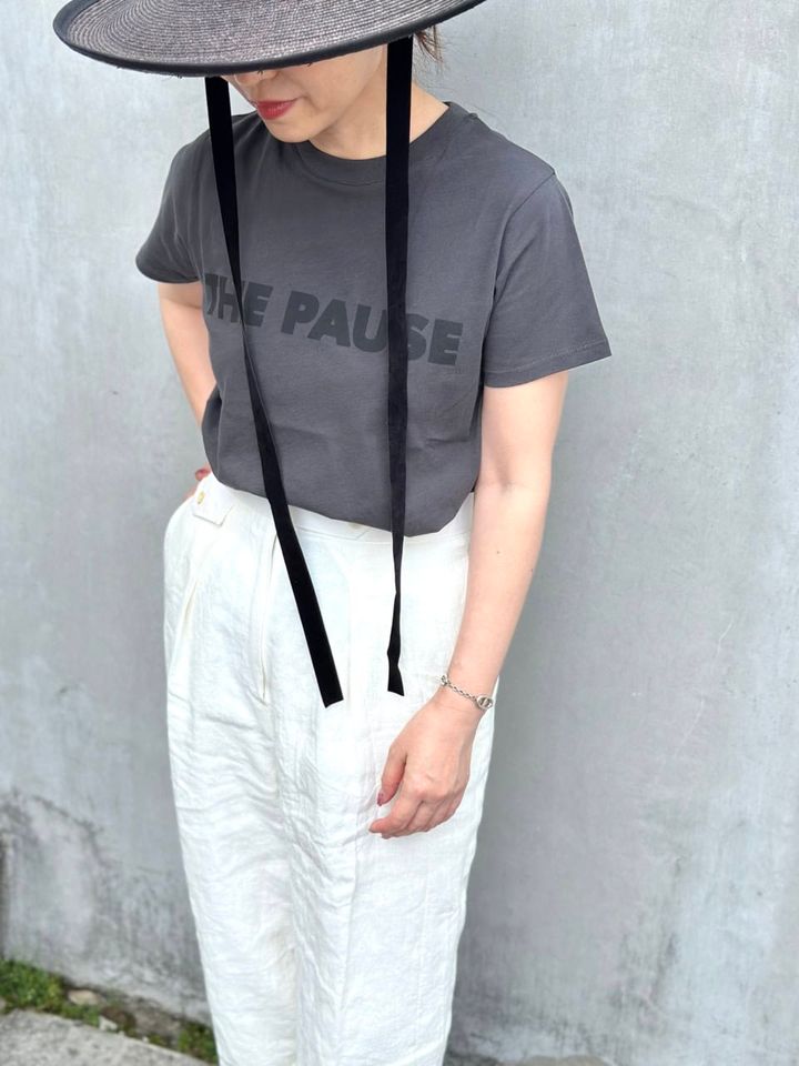 「上半身がすっきり見えるシルエット。ブランド名の〈THE PAUSE〉のさり気ないロゴがポイントになりつつ、スタイリングに程よくヌケ感をプラスしてくれます。大人こそTシャツにこだわりたい、そんな方におすすめのアイテムです」Tシャツ¥7,150(ザ ポーズ/ウィム ガゼット青山店)