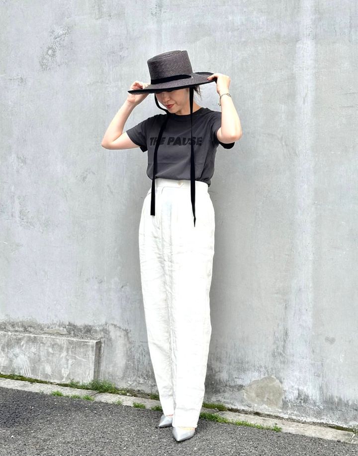 「ややコンパクトなサイズ感のTシャツに、絶妙なボリューム感のリネンパンツでメリハリのあるシルエットを意識しました。カジュアルなTシャツも上質なリネン素材と合わせることで、落ち着きのある大人の着こなしに。ツバ広のストローハットをアクセントにしました」