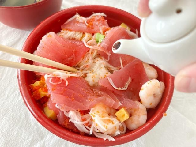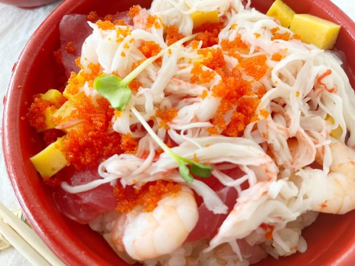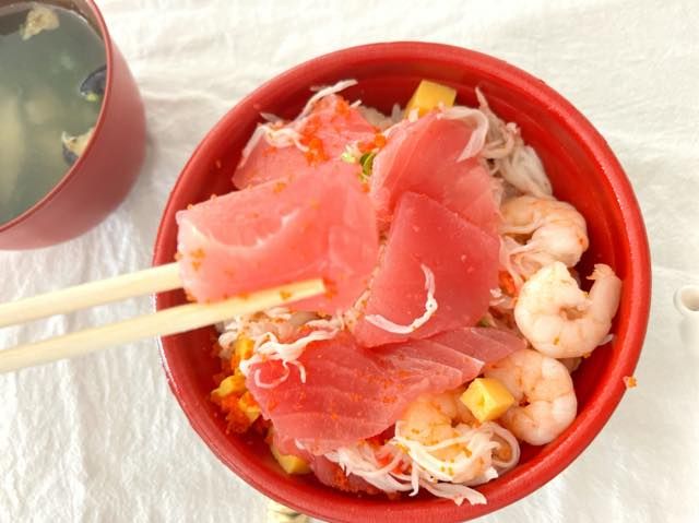 まぐろの一切れが分厚くて大きいので、これはたまりません。マグロや海老はもちろん、プチプチのとびっこ、角切りの卵、れんこん、椎茸が入っており、いろいろな食感が楽しめます。