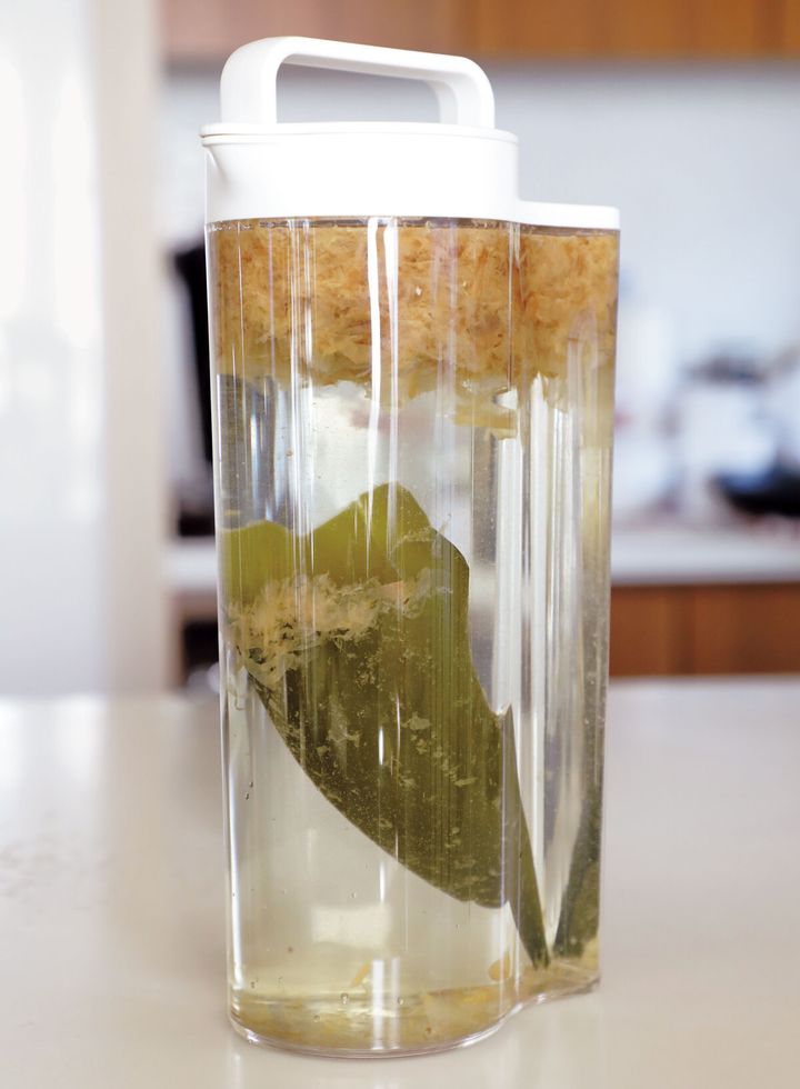 麦茶ポットなどの容器に昆布(10cm四方)1枚、削り節ふたつかみを入れ、水をたっぷり(約2ℓ)注ぐ。冷蔵庫で一晩置けば、水だしのでき上がり。