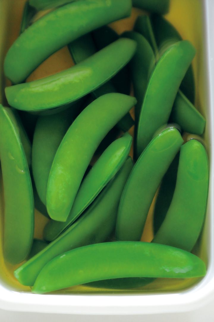 (2)スナップえんどうを加えて1分ほどゆで、ざるに上げる。流水でさまし、水けをきる。保存容器に〈漬け汁〉 の材料を混ぜる。スナップえんどうを加え、30分ほどおく。