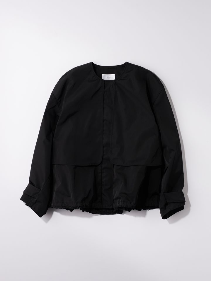 裾のドロストで丸みのあるバルーンシルエットが作れるブルゾン。ノーカラーで、ハリのある素材なのでカジュアルな着心地ながらキレイめな印象に。季節の変わり目、冷房除けにと春~秋まで長く使えます。ブルゾン¥36,300(SETENS)