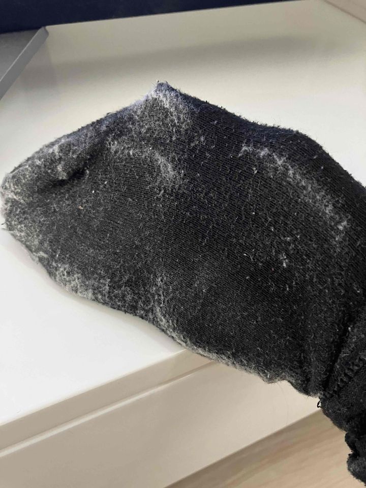 白なので分かりにくいですが、靴下で掃除してみると、こんなに取れます