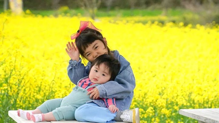 黄色の菜の花に、ブルー×ピンクのきょうだいコーデが映えてます。お姉ちゃんに身を預けてリラックスモードの妹ちゃん。とっても癒やされます。
