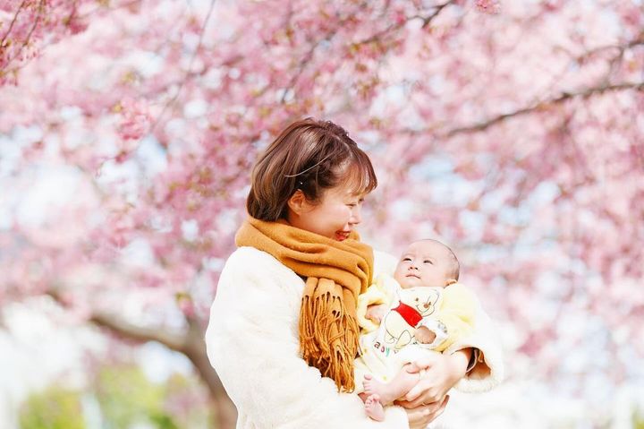 満開の河津桜をバックに、生後4カ月の赤ちゃんとママの2ショット。桜の花を見つめて、何を思っているのかな?