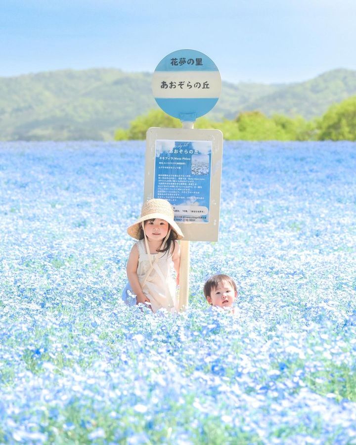 視界いっぱいに広がるネモフィラのなかに、かわいい姉妹が♡