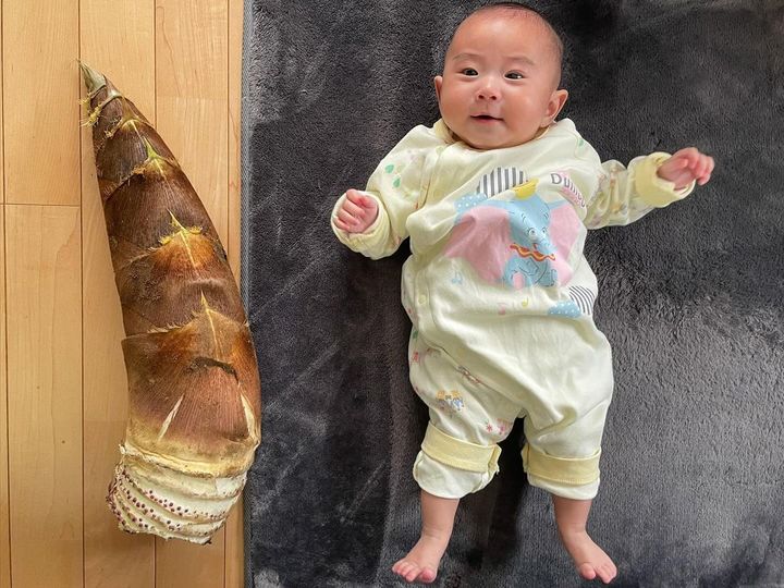 タケノコ掘りで収穫した大きな1本と背比べ。タケノコのようにすくすく育ちますように。