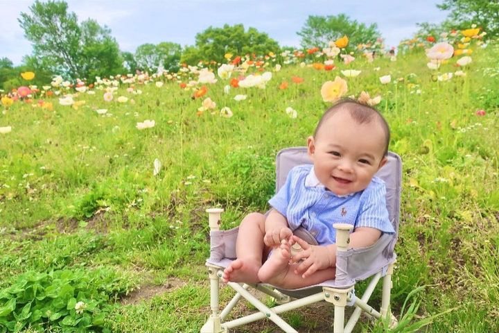 折りたたみ式のベビーチェアに座ってポピーの花を観賞。ママに向けた笑顔が楽しさを物語っています。