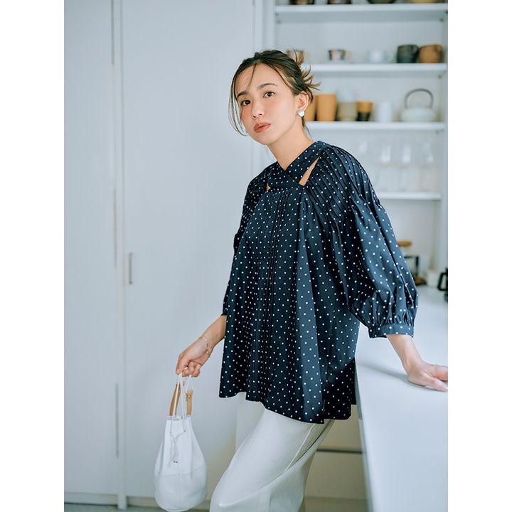 3. ママの定番【甘ブラウス】はドット柄が新鮮!大人の肌見せがヘルシー