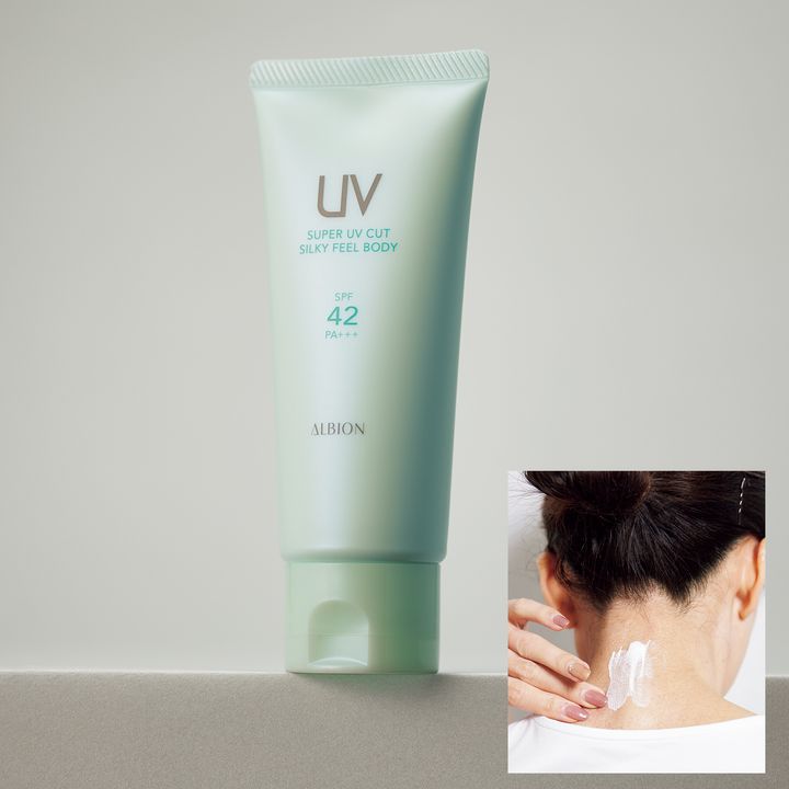 みずみずしく肌を整え、汗や皮脂のベタつきを感じさせないさらりとした質感を実現。紫外線(A・B波)からもしっかり肌をバリア。暑い季節でも快適な、うるツヤシルキーボディに。SPF42・PA+++ 100g ¥3,630(アルビオン)
