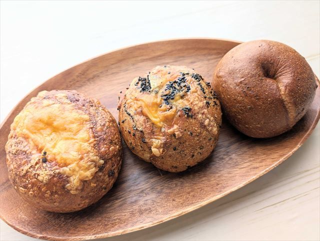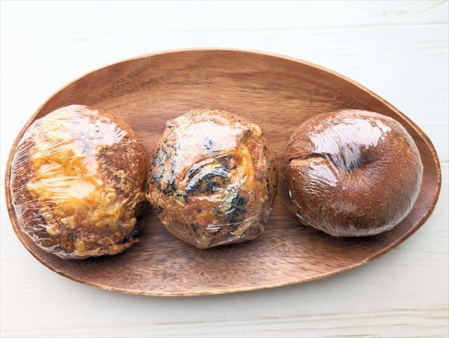 続々と焼きたてが並ぶ中、迷いながらも「tecona bagel works」の特徴である「もち」「むぎゅ」「ふか」のベーグル3種をそれぞれ購入したので、実食しながらご紹介します!