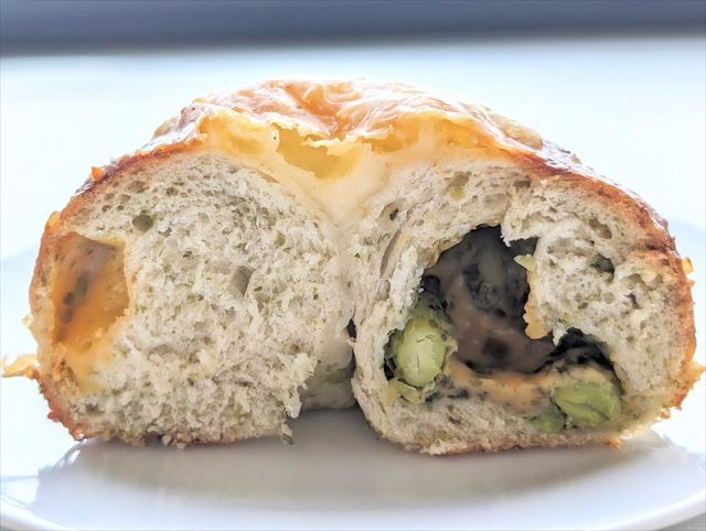 切ってみると先ほどの「もち」のゴーダチーズより生地の密度が濃く、しっかりとした歯ごたえです。生地全体に青のりが練り込まれているので、満遍なく香りが楽しめます。そこに焼きあがったチーズの香ばしさととえだまめの食感がプラス。それぞれのバランスが丁度よく、マイルドなしょっぱい系ベーグルです。